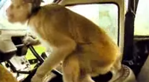 動画を見る限りアクセルやブレーキはどうしているのか、分かりかねるが、まるで映画のシーンさながらの演出で、猿にパーツを取られた運転手も呆気にとられている。