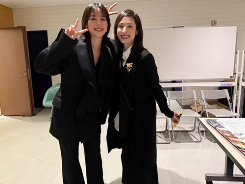 公開された舞台裏で撮影した2ショットは、立体的なデザインが施された黒のジャケットとパンツを合わせたモードなセットアップ姿ののんと、黒を基調にしたロングジャケットに白シャツを合わせたシックなスタイルで、胸元にはブローチをあしらい上品さを添えたコーディネート姿の天海が、並んで寄り添いながら笑顔を浮かべている。