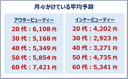 アウタービューティーとインナービューティーそれぞれに月々かけている金額を聞いたところ、平均金額はどの年齢層でも1,000円~2,200円ほどアウタービューティーの方が高い結果となりました。インナービューティーは、栄養バランスや生活習慣など、お金をかけずに意識できることも多い中でも、各世代一定の金額を使っているようです。また、若い世代である20代が、50代・60代に次ぐ平均金額となり、メイクやスキンケアといったアウタービューティーだけでなく、内側から美しくなるインナービューティーにも注目し、ある程度お金をかけていることが見て取れます。