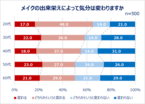 ビューティーが気持ちにも影響することを受けて、メイクの出来栄えや肌の調子によって気分が変わるかを聞いたところ、特に 20代に気分が変わる人が多いことが分かりました。