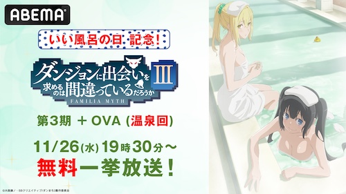 新しい未来のテレビ「ABEMA(アベマ)」は、11月26日(水)の「いい風呂の日」当日に大人気アニメ『ダンジョンに出会いを求めるのは間違っているだろうか』シリーズの“温泉回”第3期OVAを含む、第3期全話を無料一挙放送する。