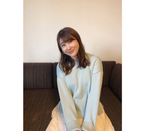 安めぐみ、淡ブルーニット&上品なドット柄ワンピ姿を披露