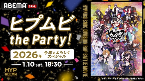 新しい未来のテレビ「ABEMA(アベマ)」は、音楽原作キャラクターラッププロジェクト『ヒプノシスマイク -Division Rap Battle-』の“重大情報を解禁”する特別番組『ヒプムビ the Party! 2026年今年もよろしくスペシャル』を2026年1月10日(土)18時30分より独占無料生放送。同日20時からは初の映画『ヒプノシスマイク –Division Rap Battle-』を声優キャストと一緒に楽しめる応援上映会を「ABEMA PPV」にて独占放送する。
