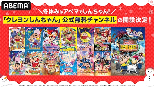 新しい未来のテレビ「ABEMA(アベマ)」は、「クレヨンしんちゃん」シリーズを毎日無料放送する「クレヨンしんちゃん」公式無料チャンネルを12月27日(土)から期間限定で開設することを決定した。