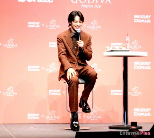 甘いものが大好きという神尾はこの日、チョレートを思わせるブラウンのスーツを纏い登場。「ミスタードーナツとゴディバということで、上品さと高級感をイメージしてブラウンでまとめ、大人チョコっぽさを意識しました」と語り、さらには両者のコラボについて「ドーナツもチョコレートも好きなので夢のコラボ」と喜びをあらわに。