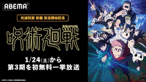 新しい未来のテレビ「ABEMA(アベマ)」は、大人気アニメ『呪術廻戦』第3期「死滅回游 前編」の放送開始を記念し、初となる第3期の無料一挙放送をはじめ、TVアニメ『呪術廻戦』全話の無料一挙放送を1月22日(木)、24日(土)に実施する。