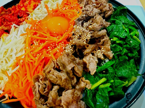 続く「ホットプレートで」と題したブログでは、ホットプレートいっぱいに盛り付けられたご飯の上に、甘辛く味付けされた牛肉、キムチ、色鮮やかなほうれん草、にんじん、もやし、そして中央には卵黄をトッピングした食欲をそそる“ホットプレート石焼ビビンバ”の完成ショットを披露。