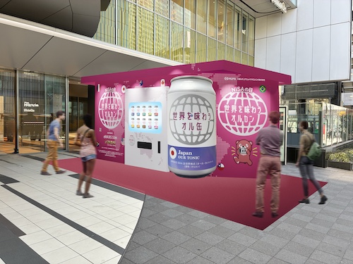 会場では、この「オル缶」が並んだ自販機が置かれ、LINE アンケートに答えて専用の巨大コイン「オルカンコイン」を入れると最低1本、最大で10本出てくる仕組みに。