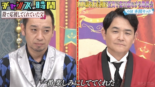 トップバッターを務めたや団の本間キッドは「父親はすごい真面目な人で、冗談を言ったことがないような人」と語り始め、厳格だった父との関係を回顧。「30歳までに売れなかったら芸人をきっぱり辞めろ」と厳しい条件を出されていたが、結局結果を出せないまま月日が流れ、父親は病に倒れて亡くなってしまったと語る。そんな父親の遺品整理の際に知られざる事実が判明し……「親父の墓にキングオブコント優勝したよって報告するのが最後の親孝行」と語った本間に、一同は静かに聞き入るが、肝心な変顔披露の場面で、本間を挟んで相方のロングサイズ伊藤と中嶋享が両脇で変顔を披露すると空気は一変。大悟が「両サイドが入りません」と一蹴すると、ノブも「冷めました」と酷評。「両サイドさえなければ高得点」とノブが続ける中、大悟は「あなたたちに変顔を背負えるトークはできてない」と冷静に分析し、笑いと余韻が同時に残る展開に。