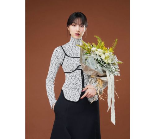 あわせて、ブラウンの背景を背にウエストラインを強調するデザインが印象的な小花柄のハイネックトップス、ブラックのミディ丈スカート、足元には深みのある赤のストラップシューズを合わせたクラシカルでシックなバレンタインらしいコーディネートで、花束を抱えた姿を披露。