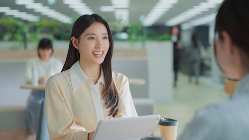 「抜擢」篇では、オフィスのフリースペースで土屋さんが「もっとうちも AI で生産性を上げるべきよ!」と意気揚々と語り、「SKYPCE」のAI アドバイザー機能について同僚に紹介。それをこっそり聞いていた吉田社長は、翌日土屋さんを社長室に呼び出し、期待を込めた表情で「君に任せた」と一言。土屋さんが驚きとともに「AI 推進室長」に抜擢されるドラマチックな展開に。
