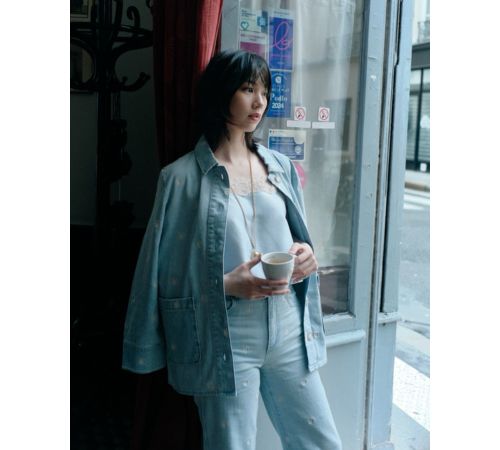 さりげない小花の刺繍がアクセントな淡いブルーのデニムセットアップにレースのインナーを合わせた装いで窓辺に立ちコーヒーカップを手に物思いにふける姿や、カーディガンはボタンを留め、赤いドットスカートを合わせたコーディネートでは、バルコニーにもたれながら遠くを見つめる姿、大胆なバックオープンが特徴のブラウンのドットトップスにシンプルなパンツスタイルでパリの街を歩く自然体な姿などとなっている。