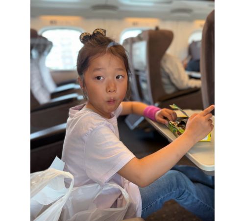 今回の旅は「バックパック1人1つのみ」という身軽なスタイル。「小旅行スタート」「女子旅 仲良く 無事に 楽しもうね」と娘との旅への思いも記し、車内でおやつを手にする娘の姿を公開。