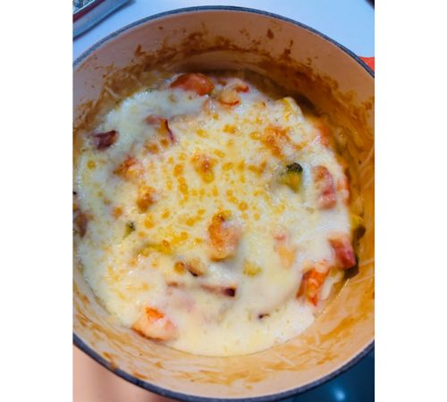 一方で肌寒い日には、「そんな日は鍋ごとグラタン作ってます」と明かし、ル・クルーゼの鍋で作るグラタンの工程を紹介。具材を炒め、小麦粉と牛乳で“手抜きベシャメルソース”を作り、そのままチーズをのせてトースターで焼き上げるという手軽なレシピを披露した。