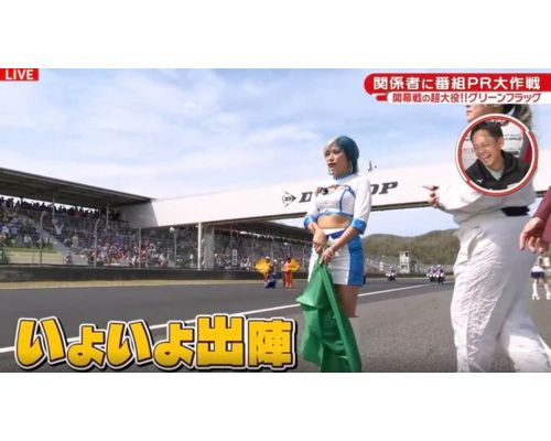この超大役を任されたのは、大胆なレースアンバサダー姿で登場したメンバーの信子。本番前にはコース脇で観客の目を盗んで何度もフラッグの振り方を練習するなど普段の奔放なギャルキャラクターとは打って変わって極度の緊張状態に陥り、スタジオの共演者からは「なにがギャルだよ!」と鋭いツッコミが。